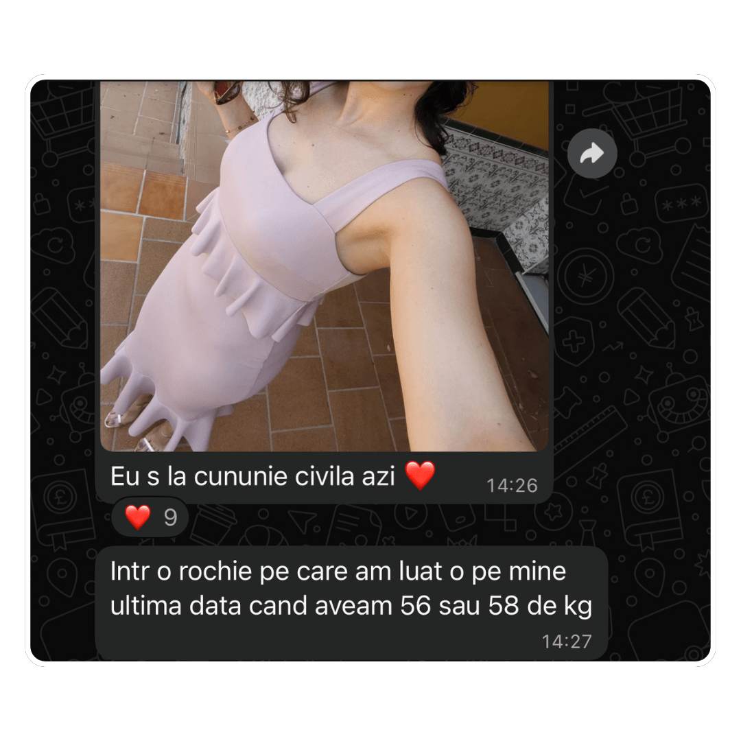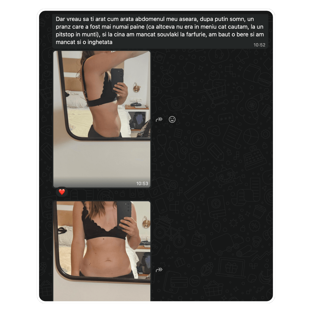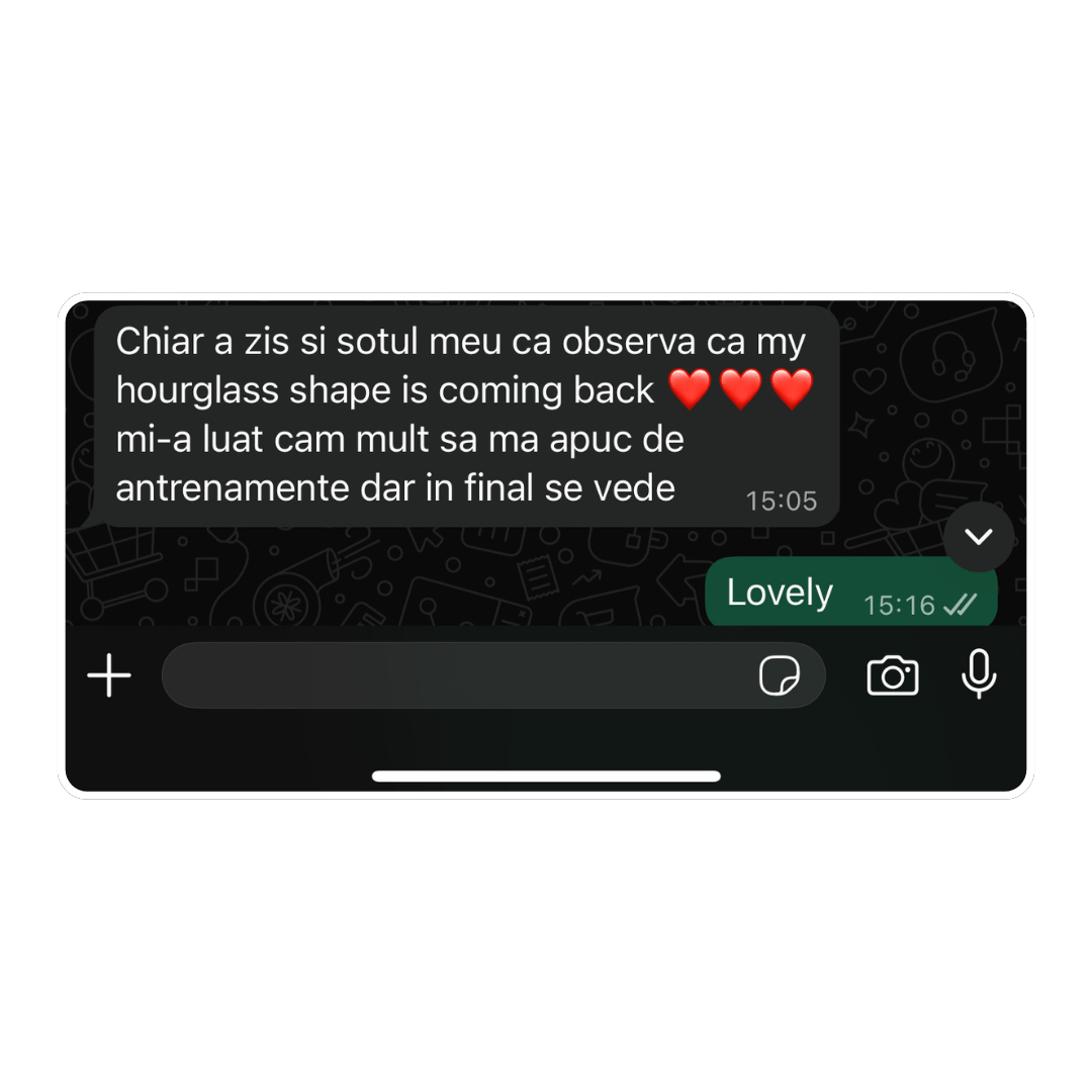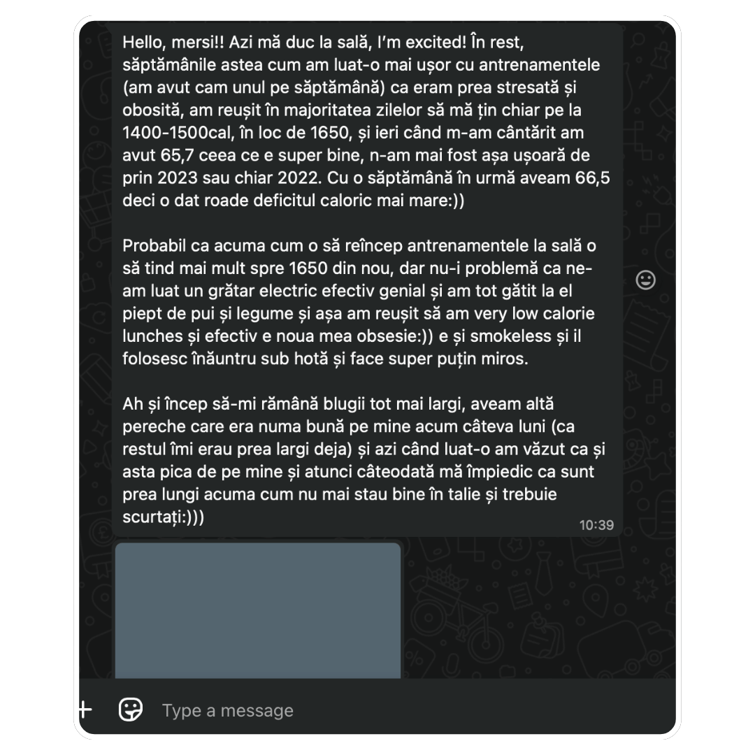 4 luni mai târziu mi-a scris: ”În sfârșit hainele nu mai stau pe mine ca pe un umeraș”. Cântarul? Deși nu ai crede, s-a dus de la 42 la 46. Burtica jos, fesierii și încrederea.