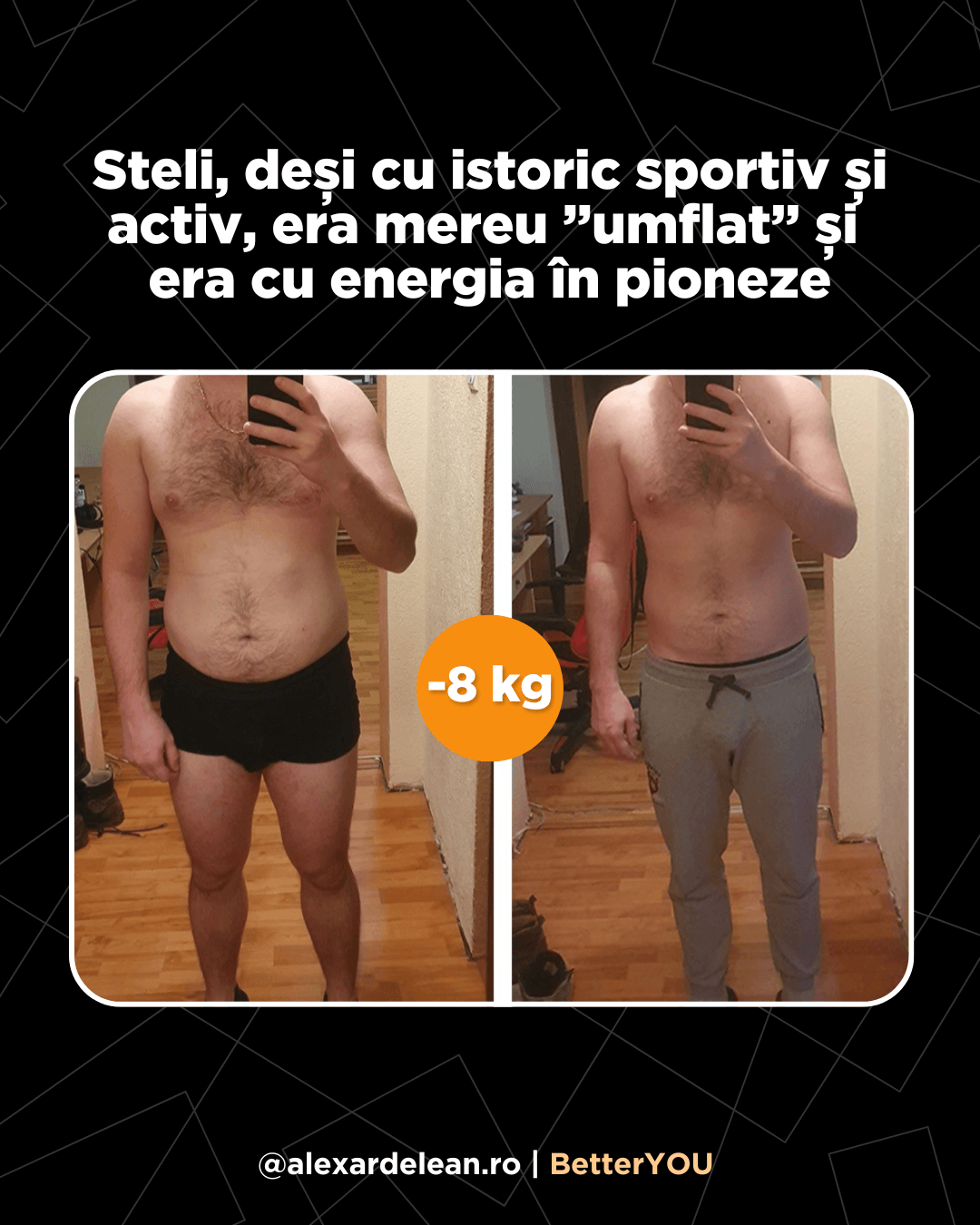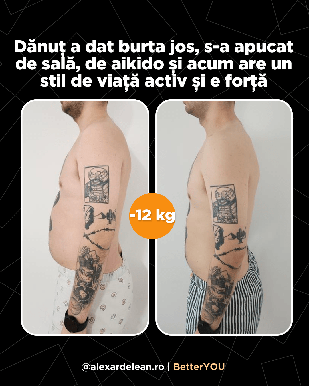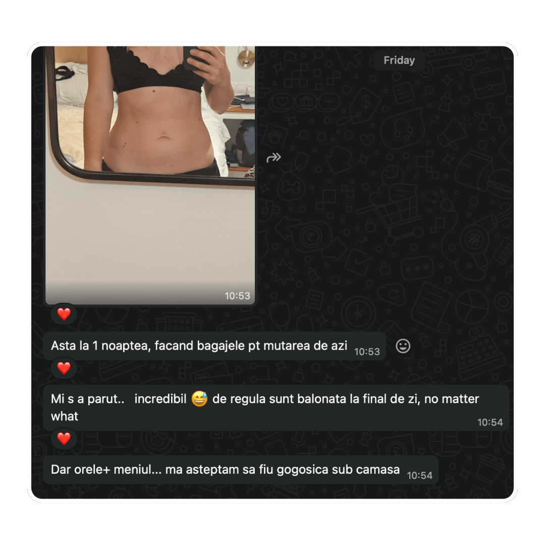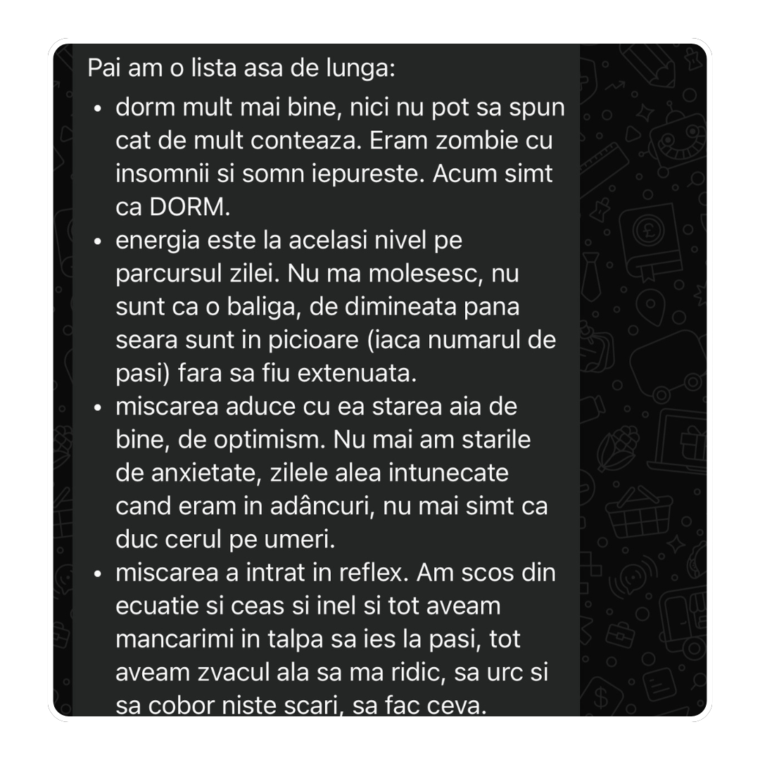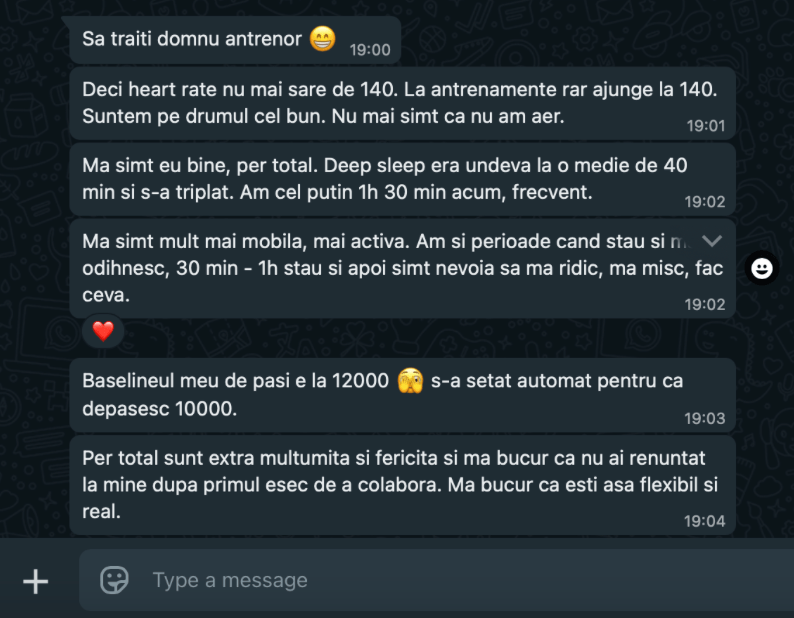 4 luni mai târziu mi-a scris: ”În sfârșit hainele nu mai stau pe mine ca pe un umeraș”. Cântarul? Deși nu ai crede, s-a dus de la 42 la 46. Burtica jos, fesierii și încrederea.