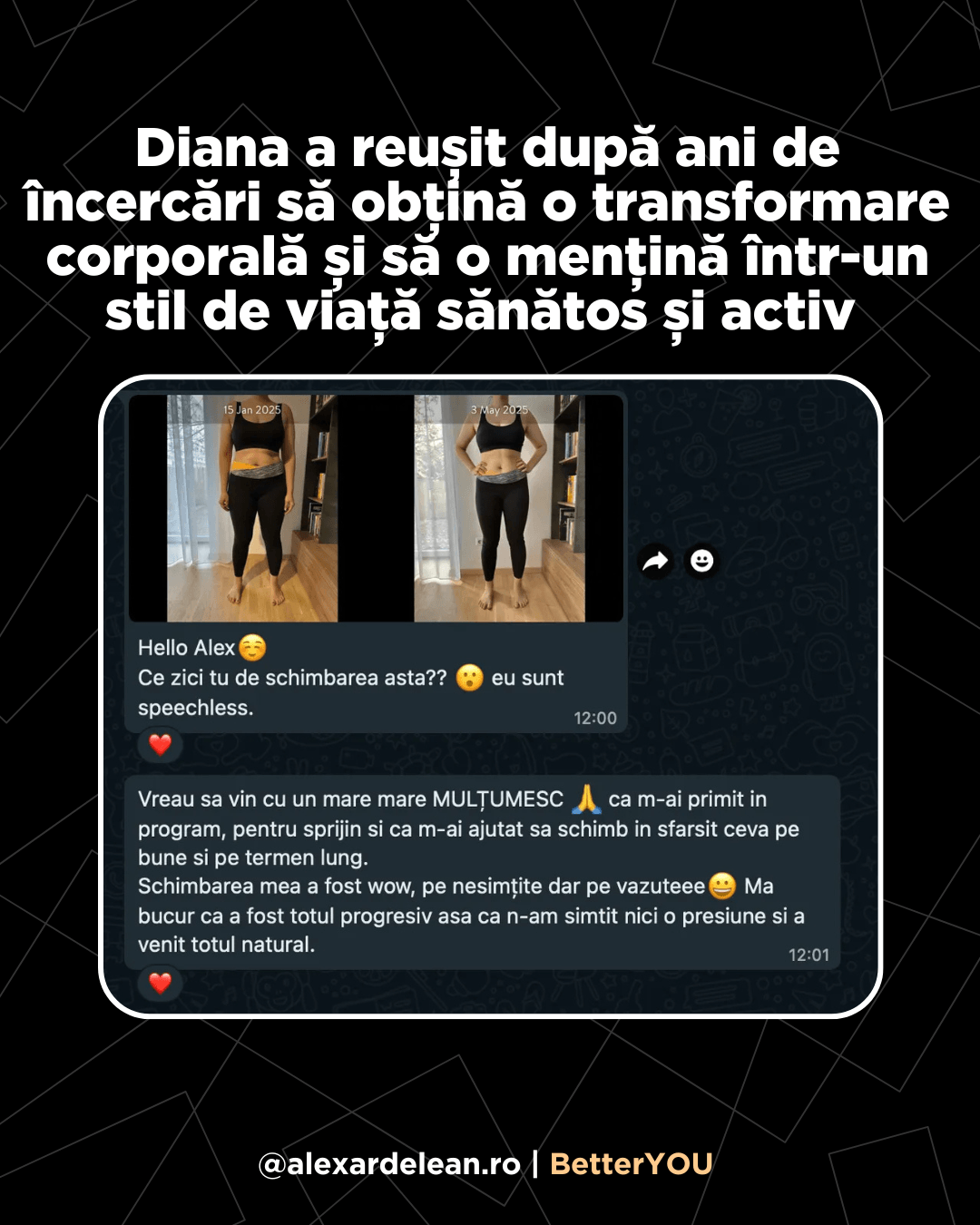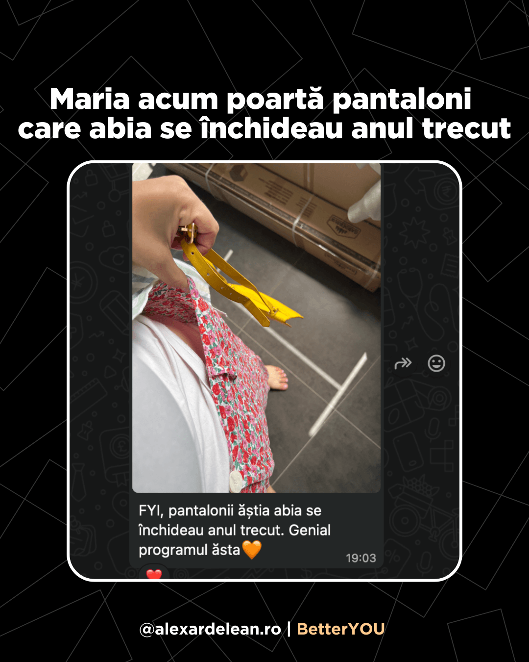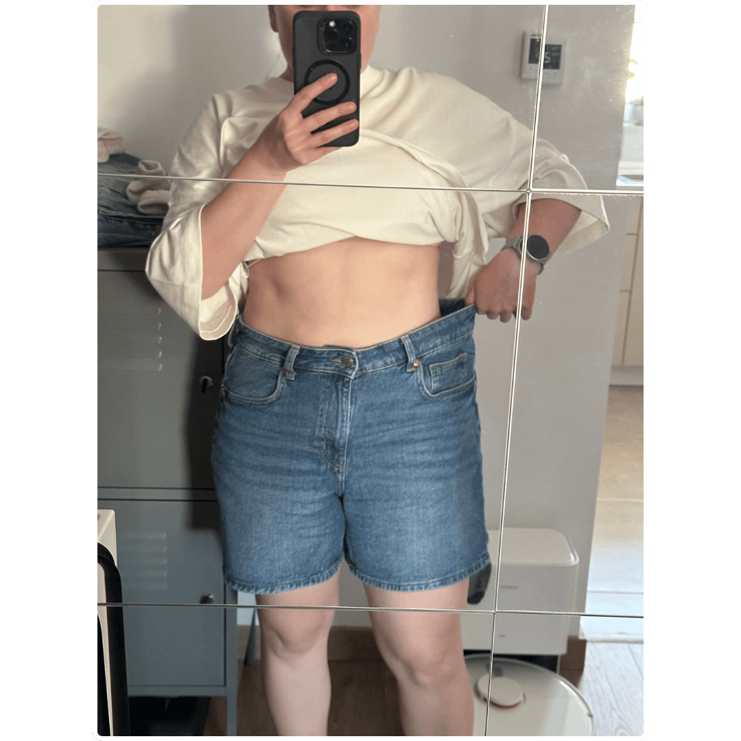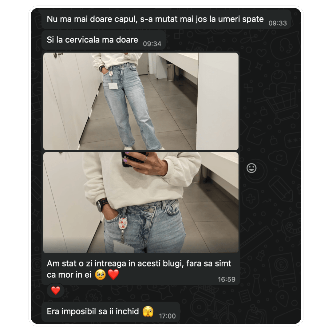 4 luni mai târziu mi-a scris: ”În sfârșit hainele nu mai stau pe mine ca pe un umeraș”. Cântarul? Deși nu ai crede, s-a dus de la 42 la 46. Burtica jos, fesierii și încrederea.