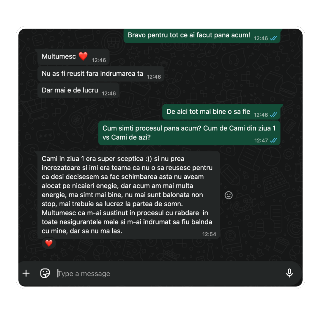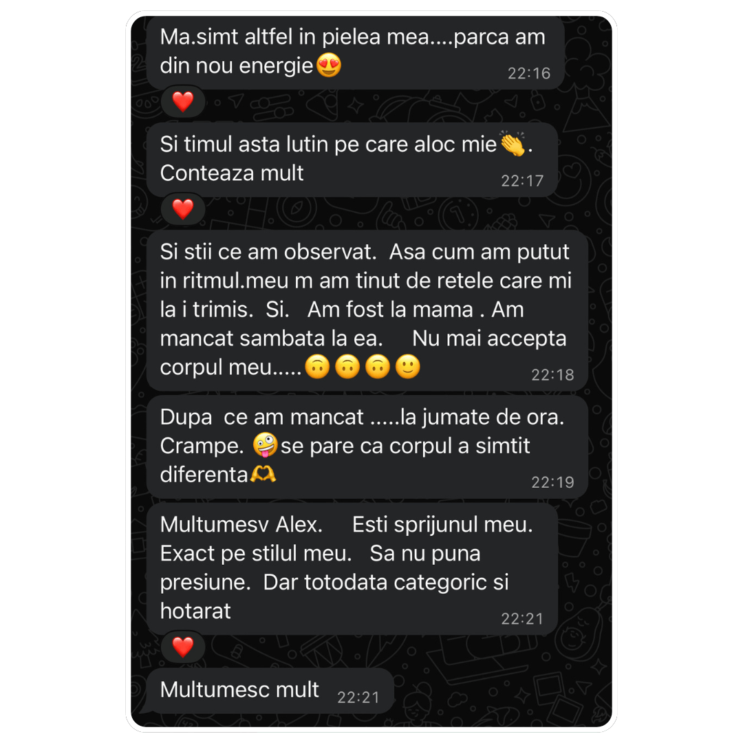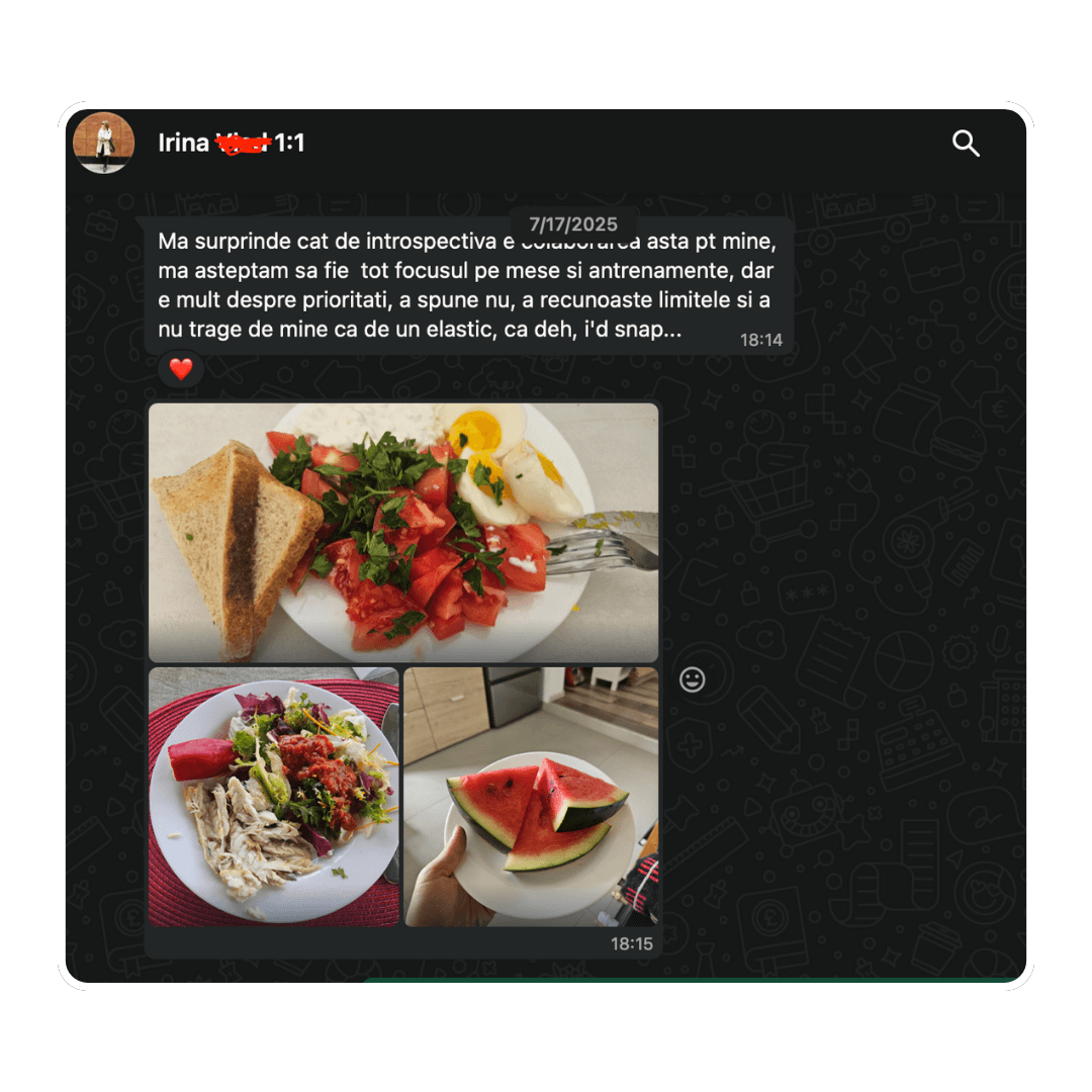 🙏 Suport în timp real: Practic când apare un eveniment, stagnare sau o perioadă mai stresantă ajustăm în funcție de ea. Sunt alături de ei la fiecare pas pe care îl fac.