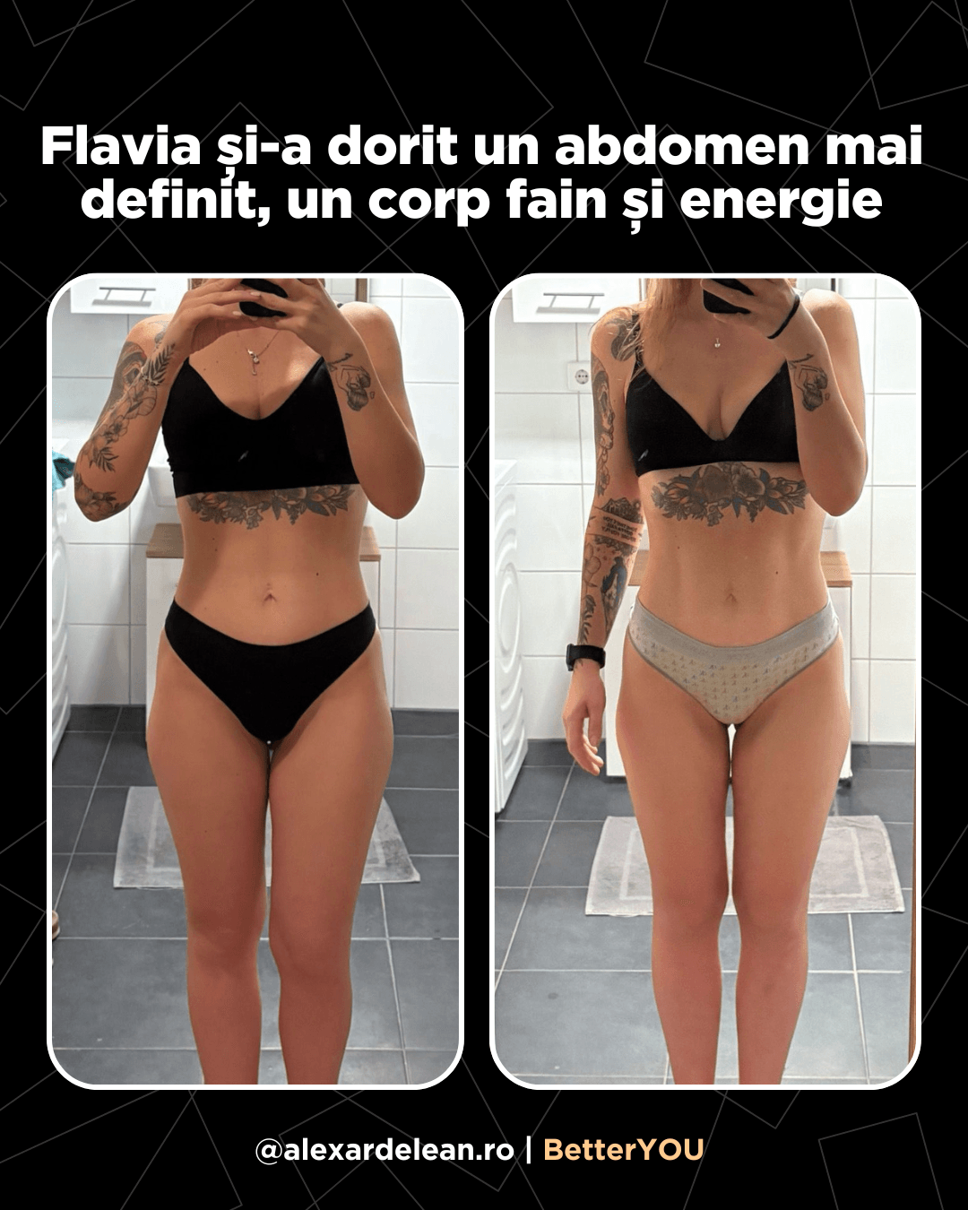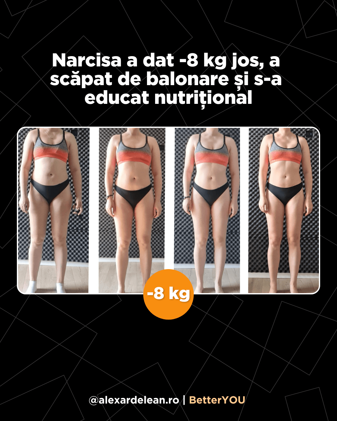 După ce am început să colaborăm, am făcut ordine în alimentația ei ținând cont de alimentele pe care corpul ei nu le tolera, i-am arătat cum e să te antrenezi cu greutăți și cu o structură eficientă și cum să gestioneze perioadele grele.